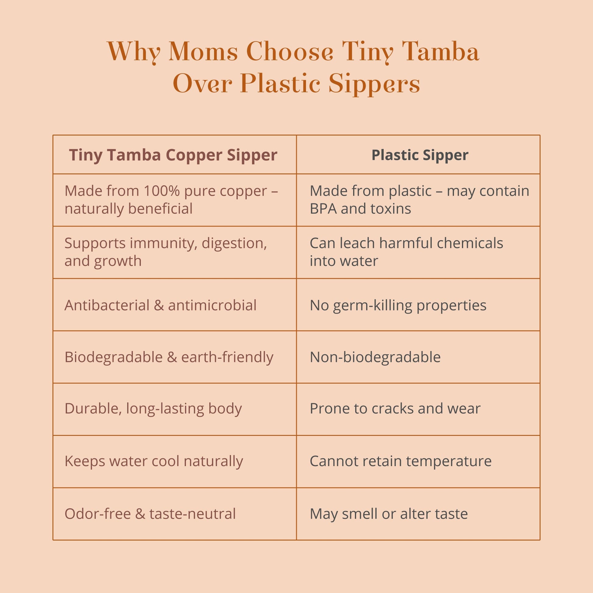 Tiny Tamba is plastic-free, made with pure copper, and reusable for years. Unlike plastic sippers that end up in landfills, it supports sustainable parenting and mindful choices for future generations.